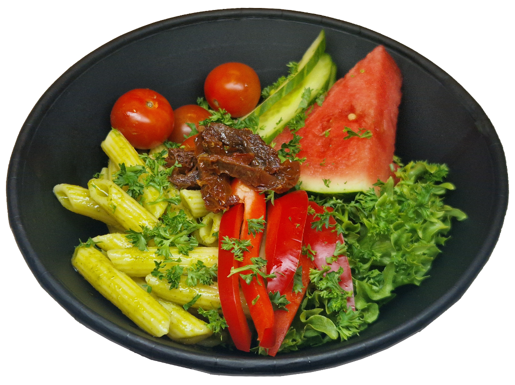 Innehåll: Kokt pasta penne (VETE) i örter med krispsallad, gurka, körsbärstomater, soltorkade tomater (vitlök), paprika, melon, persilja Vinägrett: Olivolja, rapsolja, citron, vitlök, örter, salt, svartpeppar